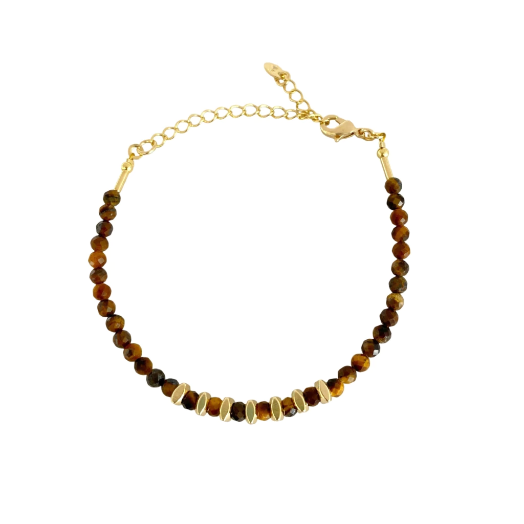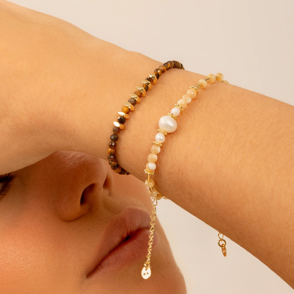 Uma pulseira autoral, elegante e repleta de significado para quem valoriza a beleza natural das pedras e o trabalho artesanal.A Pulseira Macchiato é parte da Coleção Pausa para o Café e combina pedras naturais Olho de Tigre – em tons de marrom e caramelo – com elementos em metal banhados a ouro 18k, criando uma joia com brilho e sofisticação.